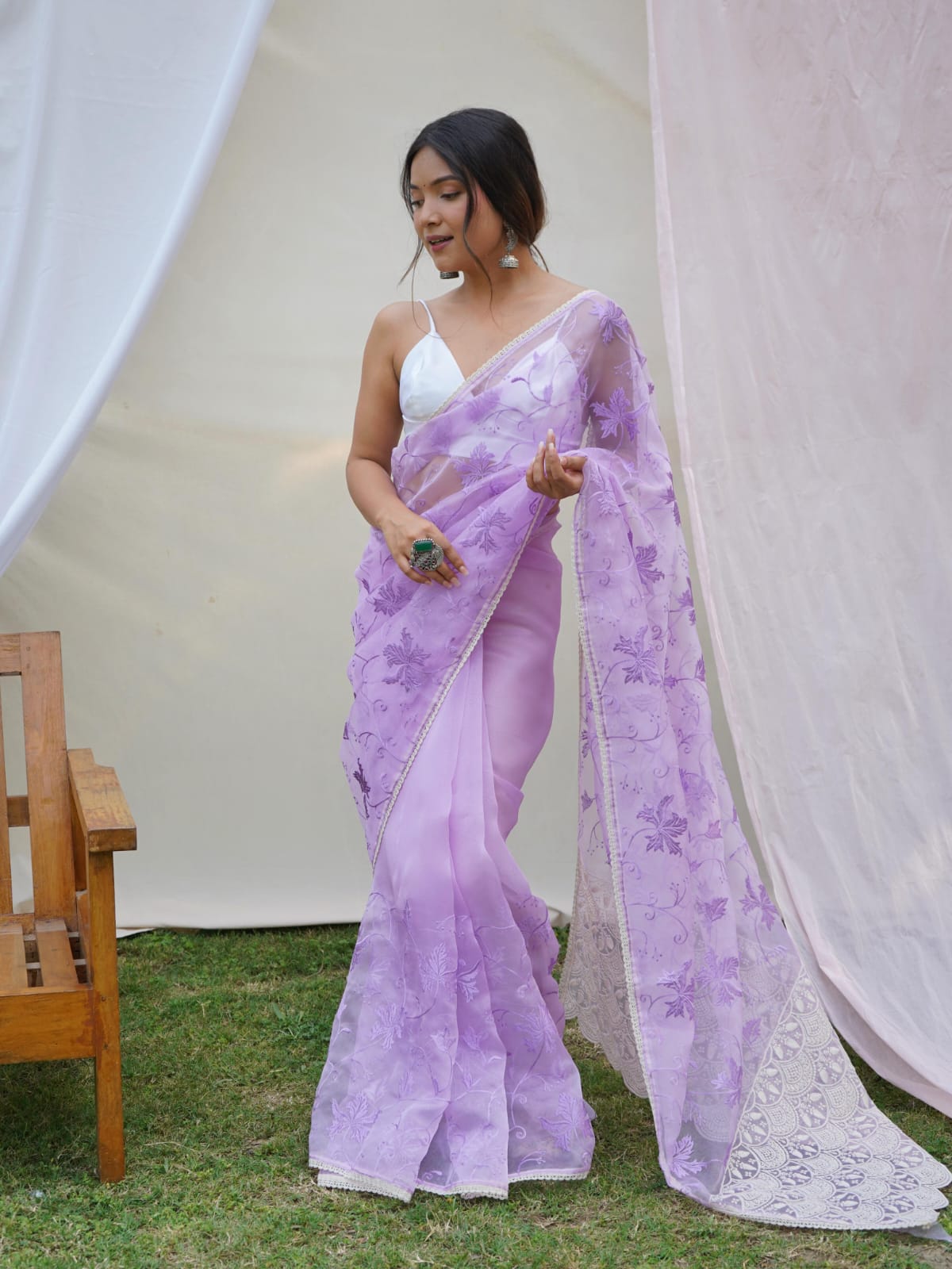 Superb Soft Refined Organza Silk Saree With Lucknowi Thread Chikankari work n also attached work viscos border too With Banglori sattin Silk white Blouse
